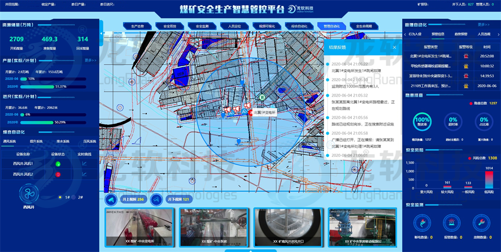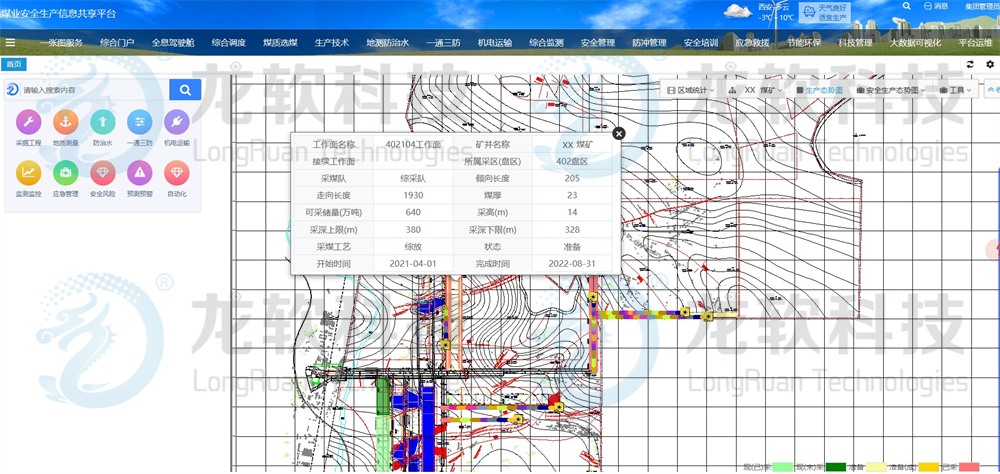 系統以LongRuan TGIS及LongRuan 4D-GIS平臺為基礎,依據“工業互聯網+智慧礦山”綠色開采、高質量發展的運營技術路線,采用礦山多維GIS“一張圖”管理理念,將煤礦“采、掘、機、運、通”等主要生產系統,以及井下環境安全、人員定位等實時系統進行融合,形成全面感知、實時互聯、分析決策、自主學習、動態預測、協同控制的安全生產智能化管控平臺,對井上下海量多源異構數據可視化展示、分析、挖掘和利用,實現礦井多部門、多專業、多管理層面的數據集中應用、交互共享和決策支持,實現各主要業務系統的智能操控與協同聯動控制,服務于智能綜采、綜掘、通風、提升、運輸等業務部門,為企業領導層正確決策提供科學依據,使領導和管理部門能夠及時、全面、準確地掌握情況,實現對“地域、業務”的全覆蓋,提升煤礦安全生產管理水平